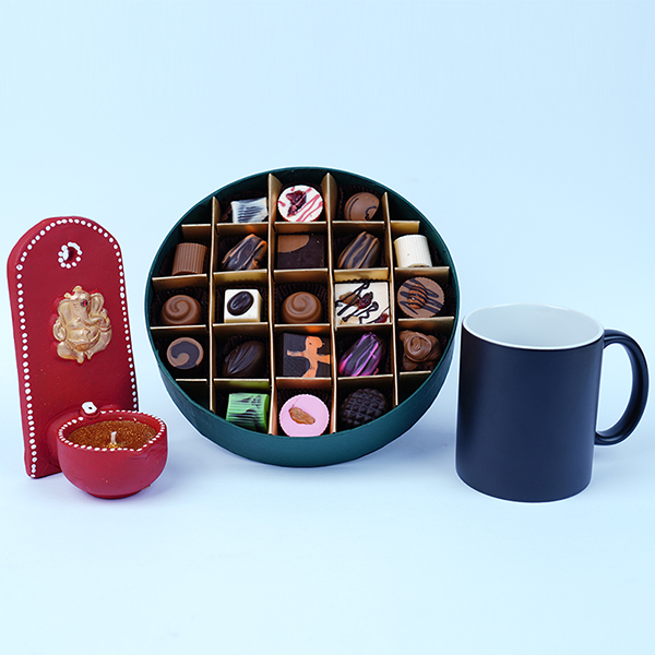Home /Diwali Best Sellers / Exclusive Hamper With Assorted Chocolates Designer Diya and Personalized Mug