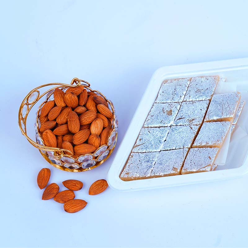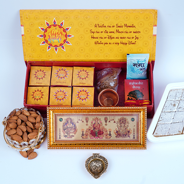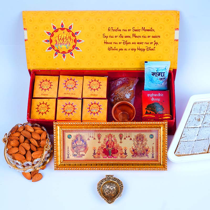 Home /Diwali Best Sellers / Golden Celebration Box with Kaju Katli Almonds and Pooja Essentials