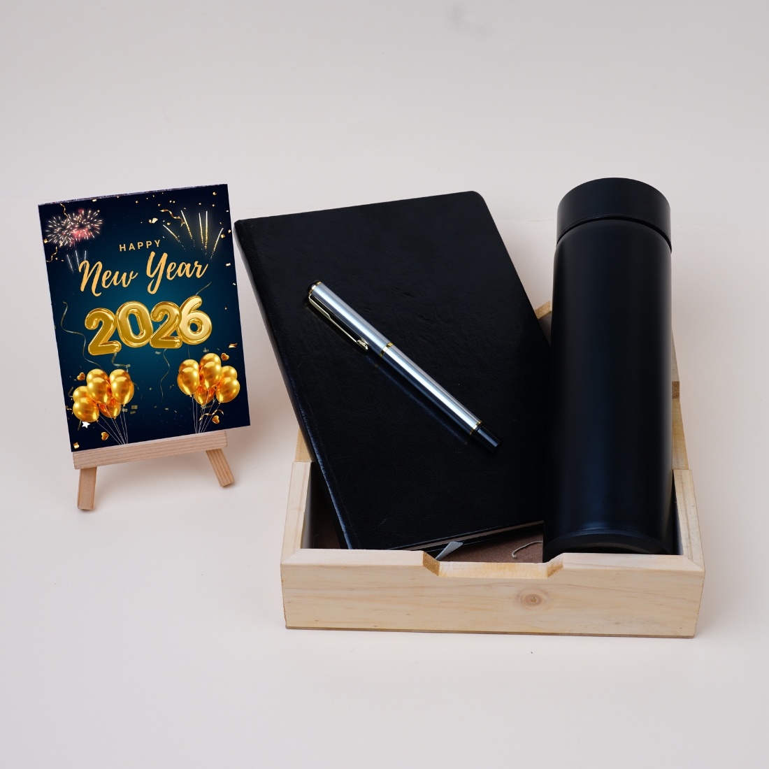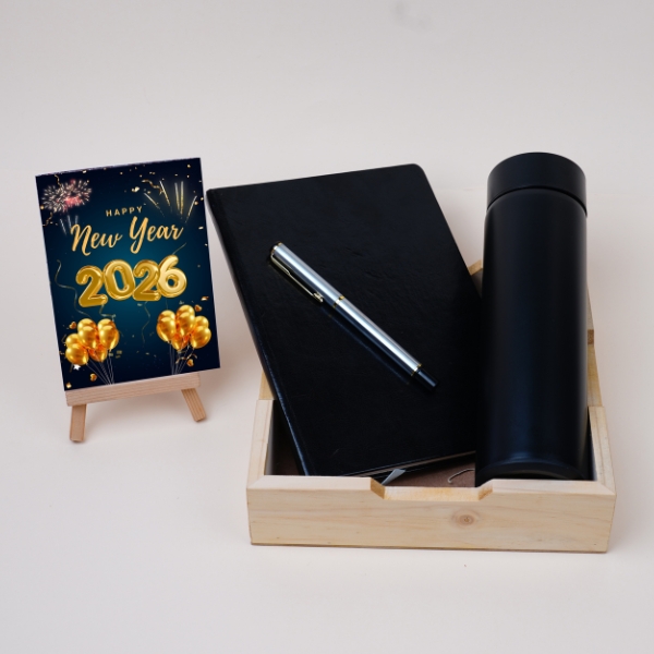 The hamper works well as a gift because each item is useful and presentable. The diary has clean pages that someone can use throughout the year, and the metal pen adds a nice touch with its smooth writing. The temperature bottle is a handy piece with a digital display that is slightly premium. Everything comes arranged on a neat wooden tray that keeps the set looking organised. In addition, the New Year best wishes card fits naturally into the collection, and gives a compliment to a simple and thoughtful gift.