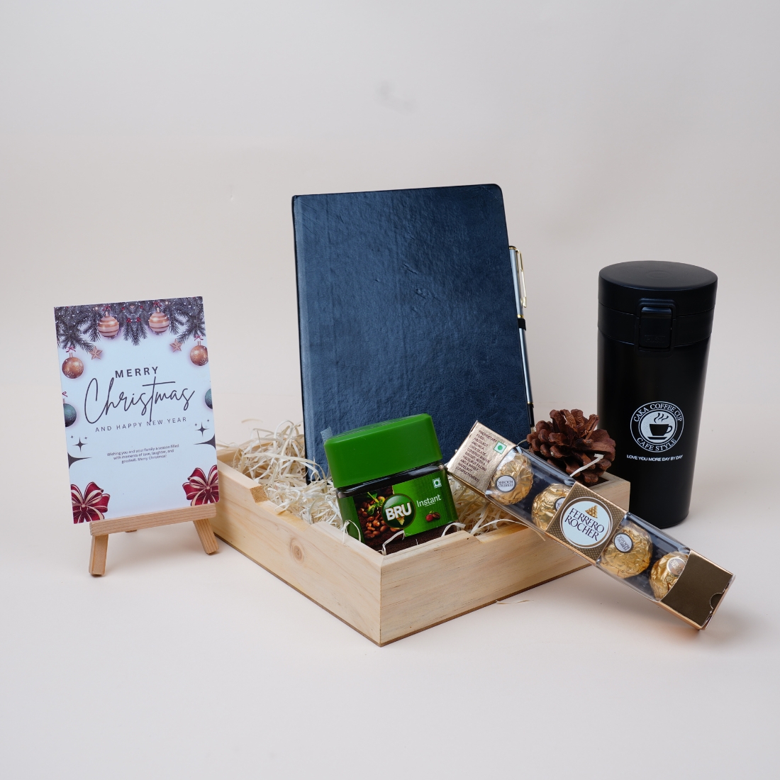 This gift set brings everything together beautifully. The diary in a blue cover has clean pages for easy notes, paired with a smooth metal pen. The travel coffee sipper and coffee jar make coffee convenient anywhere. Four Ferrero Rocher chocolates add a sweet treat. Everything sits neatly on a wooden tray, with the best wishes card completing the set. It’s a simple, thoughtful gift that looks beautiful and is ready to give.