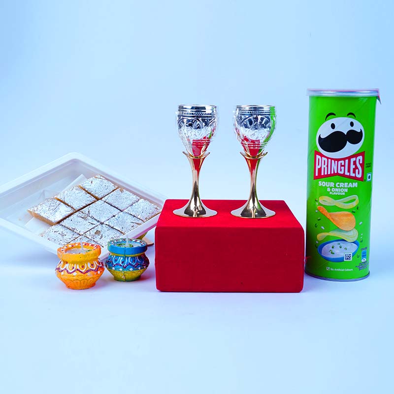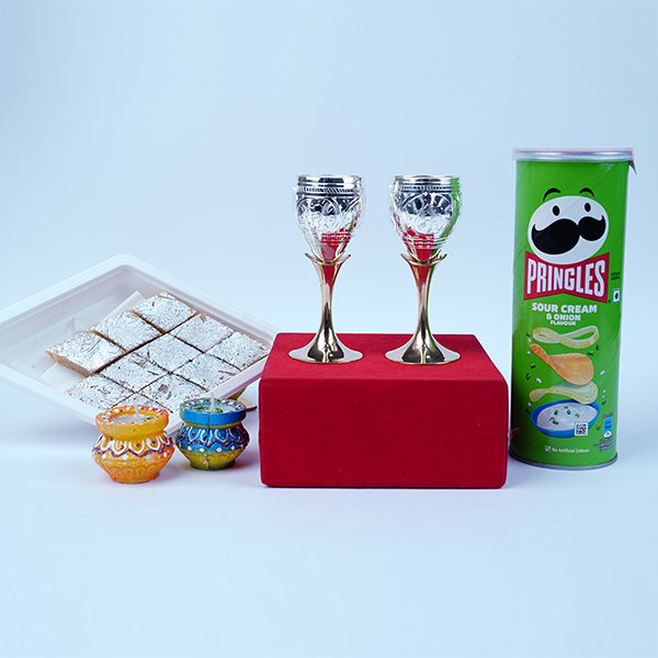 Home /Diwali Best Sellers / Premium Silver Plated Wine Glass Set with Kaju Katli Pringles and Decorative Diyas
